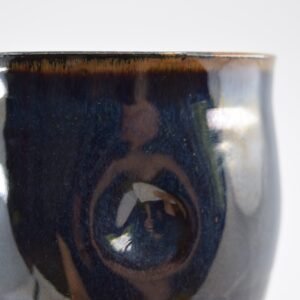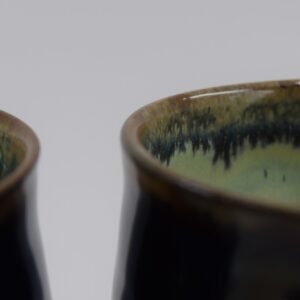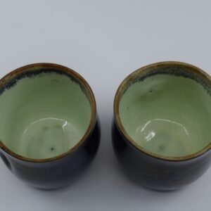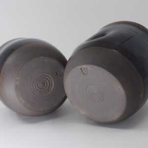 Set of two ergonomically shaped black clay cups in contrasting colours. They are made on the potter’s wheel and are 8 cm high and 8 cm in diameter. Due to the nature of the materials used and the handmade process, sizes and colours may vary slightly. The products are food safe and dishwasher safe.