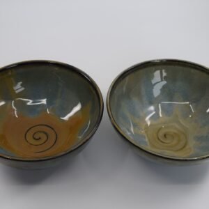 Set of two bowls made of black potter’s wheel clay, 6 cm high and 15 cm in diameter. The bowls have been deliberately glazed in the same style but in different tones so that everyone can choose their favourite bowl. The products are food safe and dishwasher safe. Due to the nature of the materials used and the handmade process, sizes and colours may vary slightly.